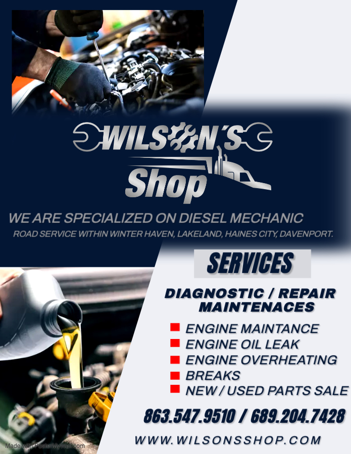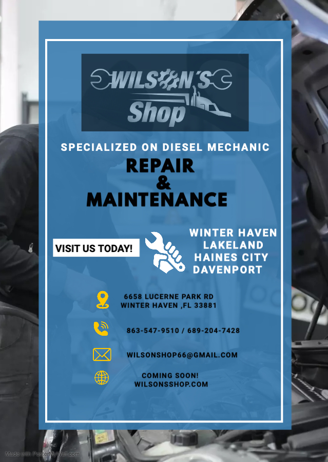 HOME Welcome to Wilson’s Shop! We are proud to be the leading semi-truck repair shop in Winter Haven, FL. Our diesel mechanics are ready to provide quality mechanical service for your semi-truck. Our skilled technicians can repair, and service all makes and models of diesel. • General Repairs • Engines • Transmissions • Differentials • Fuel Systems & Injectors • Electrical • A/C • Brakes • Clutches • Roadside Assistance • Fifth Wheel Wrecker Rental Need Finance? We accept Snap Finance Approvals Snap Finance – Apply Here